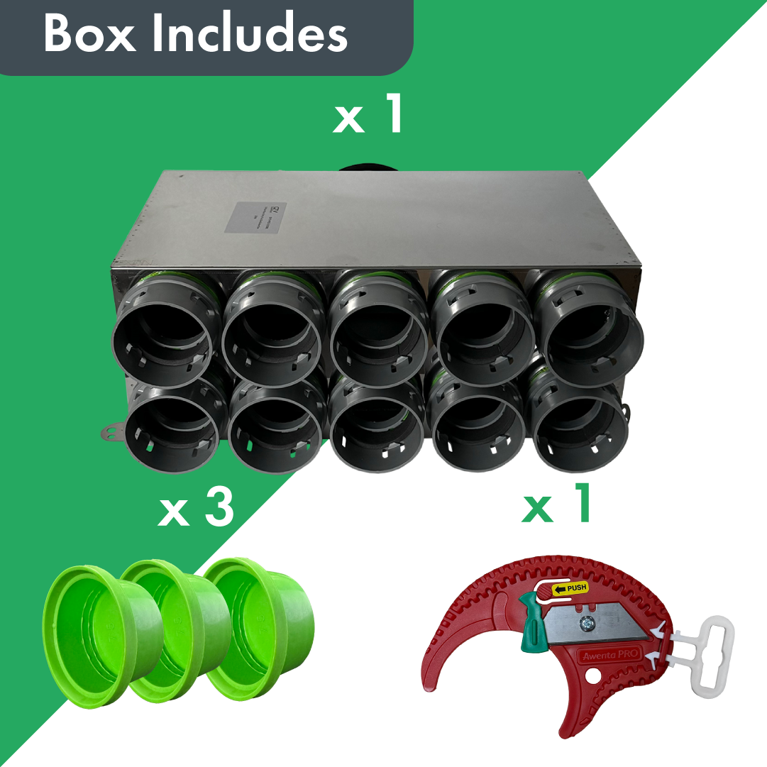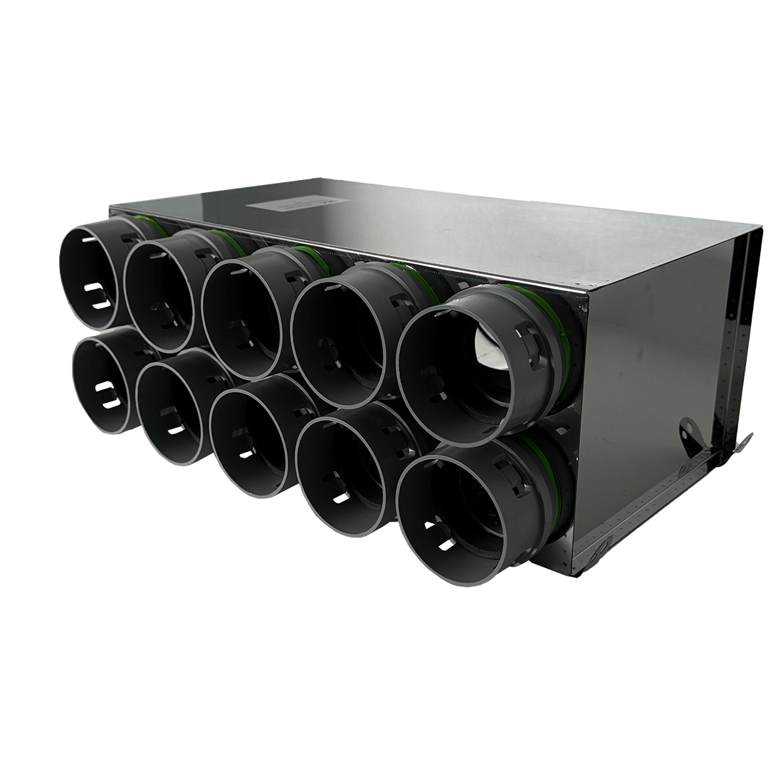 The Quiet-Vent Pro 10 Point Rear Entry Manifold is designed for optimal airflow and enhanced durability. Built from thick stainless steel, it withstands tough conditions and ensures longevity. The manifold incorporates the innovative CLICK system for quick and secure duct installation without the need for additional sealing tools. Its insulated interior improves energy efficiency and minimizes noise, making it ideal for both residential and commercial ventilation systems.
