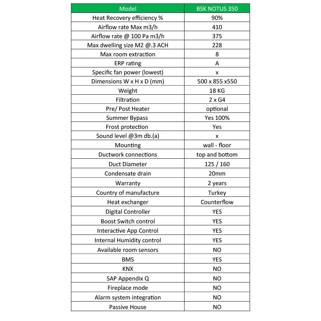 The BSK Notus 350 heat recovery unit is a quality MVHR unit manufactured of the latest EPP construction and can installed either vertically or horizontally allowing for almost all site restrictions suitable for new houses up to 225m2 that has advanced Wi-Fi controllability and internal humidity sensor