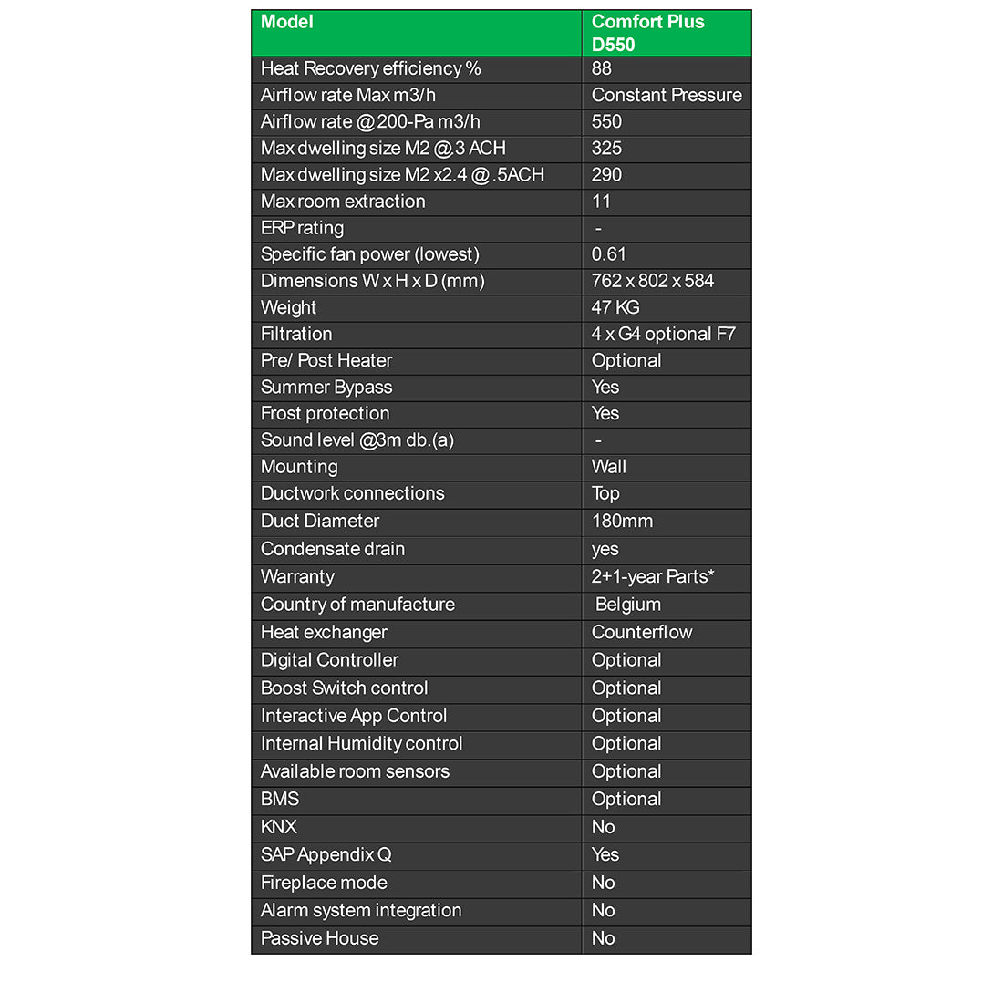 The DucoBox Energy Comfort Plus D550 is a high quality MVHR unit manufactured in Belgium and developed with the aim of guaranteeing an even quieter operation with an option of 2 zone ventilation